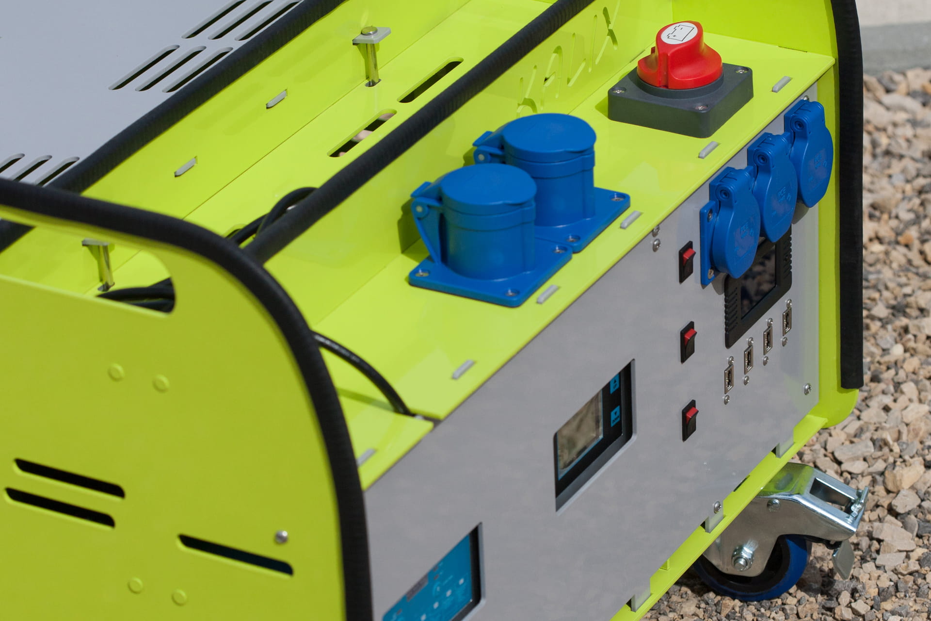 Urządzenie wyposażone jest w 2 panele słoneczne po 385W każdy z kablem o długości 10m. Energia generowana przez moduły fotowoltaiczne w ciągu dnia może być pobierana na bieżąco, a nadwyżka będzie kumulowana w bateriach.