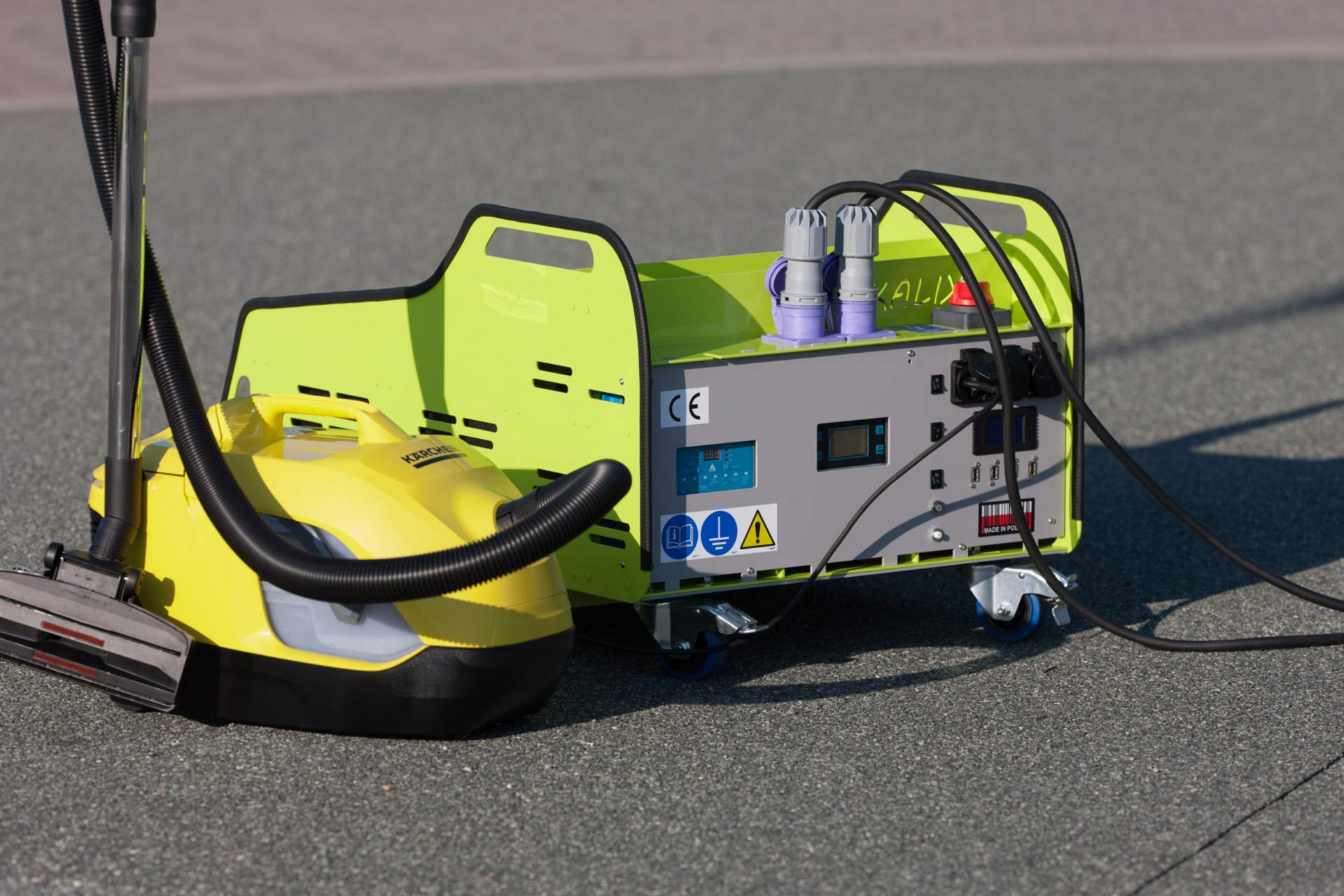 Metalowa konstrukcja z kołami i uchwytami przygotowana jest do wygodnego przetaczania i stanowi ochronę wewnętrznych komponentów.