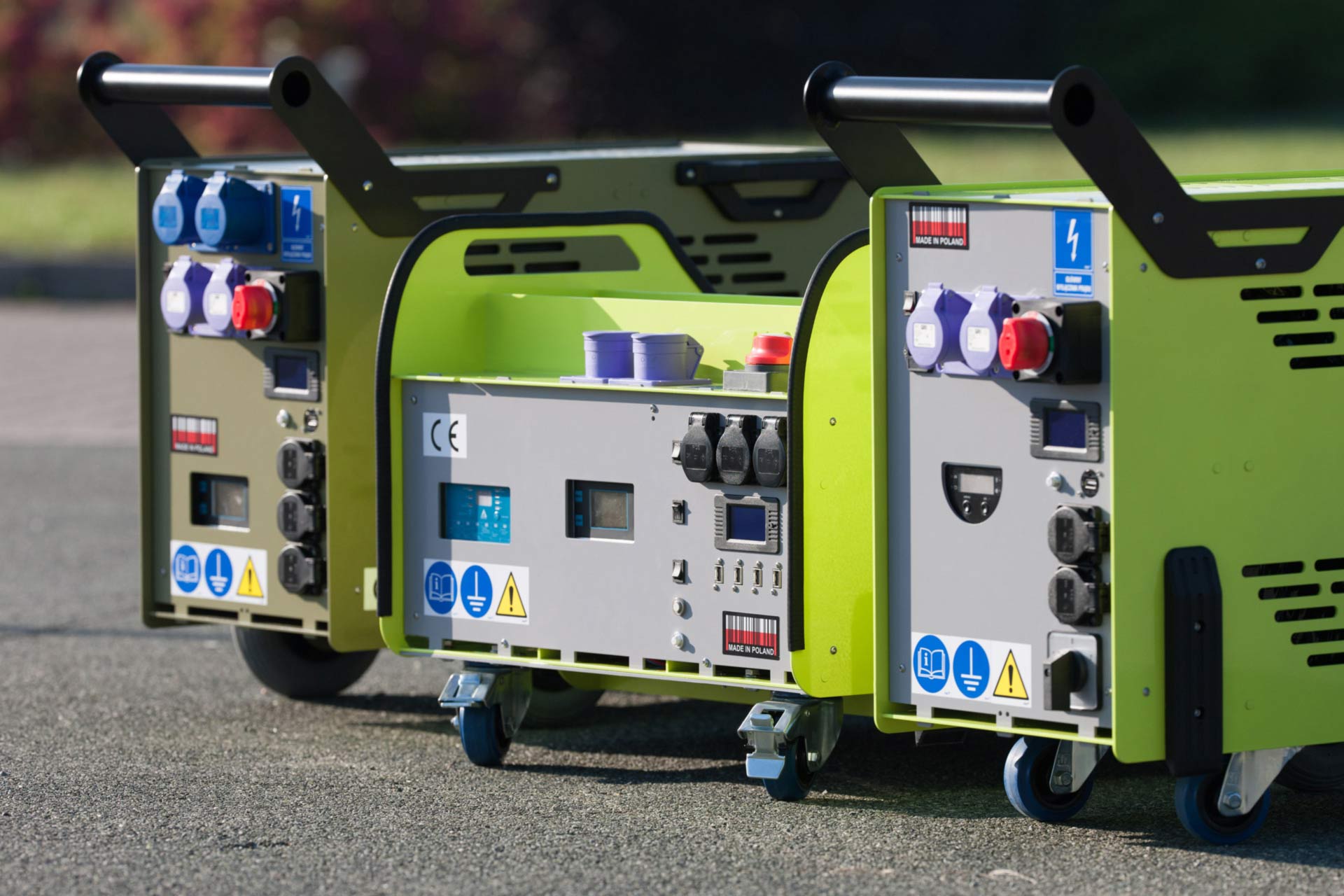 Metalowa konstrukcja z kołami i uchwytami przygotowana jest do wygodnego przetaczania i stanowi ochronę wewnętrznych komponentów.
